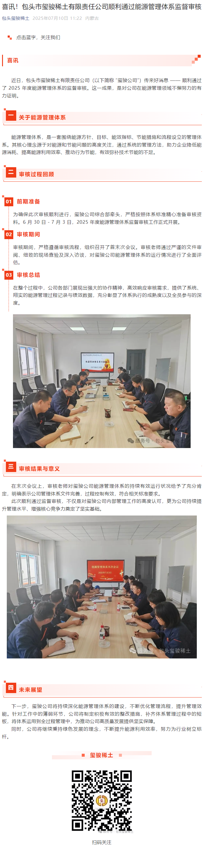 喜訊!包頭市璽駿稀土有限責(zé)任公司順利通過(guò)能源管理體系監(jiān)督審核