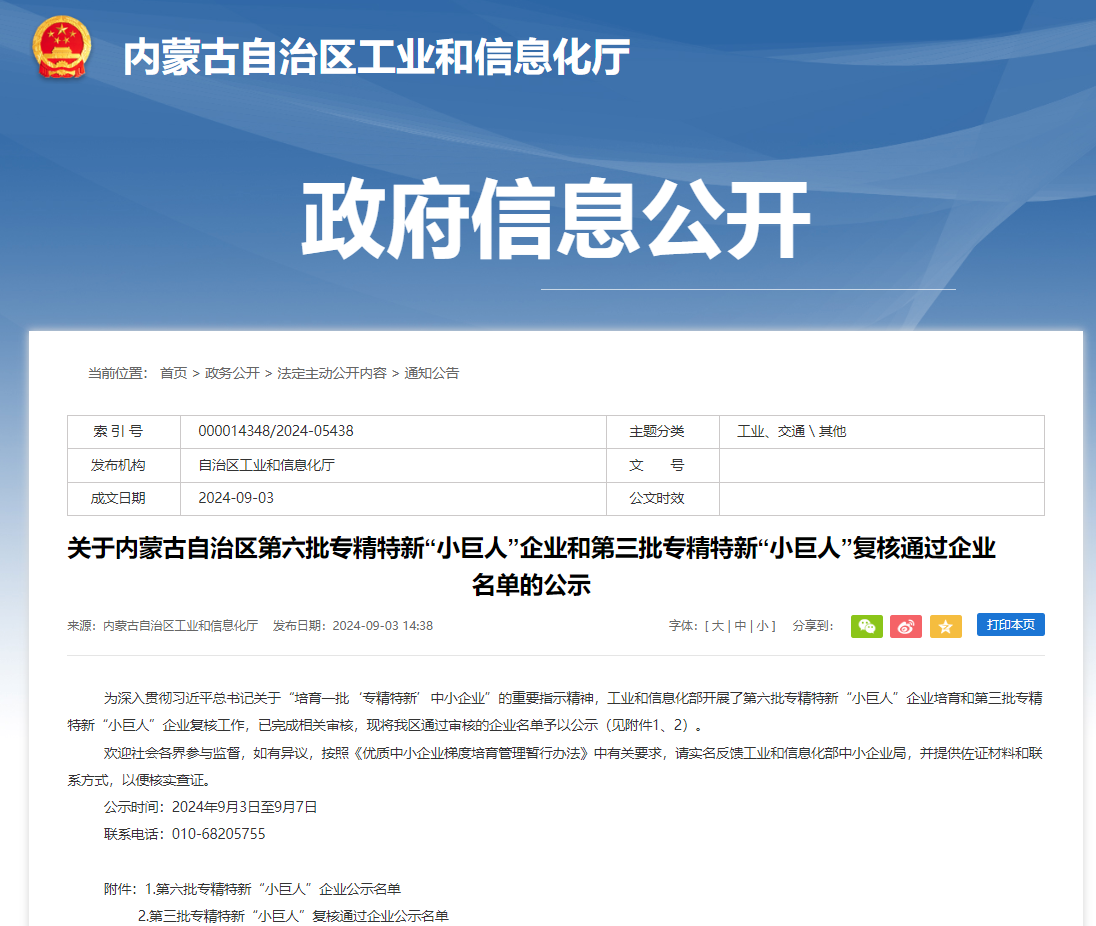 9月,工業(yè)和信息化部開(kāi)展了第六批專精特新“小巨人”企業(yè)培育和第三批專精特新“小巨人”企業(yè)復(fù)核工作,已完成相關(guān)審核,內(nèi)蒙古自治區(qū)有6家企業(yè)入圍。同時(shí)內(nèi)蒙古自治區(qū)工業(yè)和信息化廳也完成了第六批專精特新“小巨人”企業(yè)和第三批專精特新“小巨人”企業(yè)復(fù)核通過(guò)名單的公示。我公司借其卓越的核心創(chuàng)新能力及出色的創(chuàng)新成果,成功入選2024年工信部專精特新“小巨人”企業(yè)。