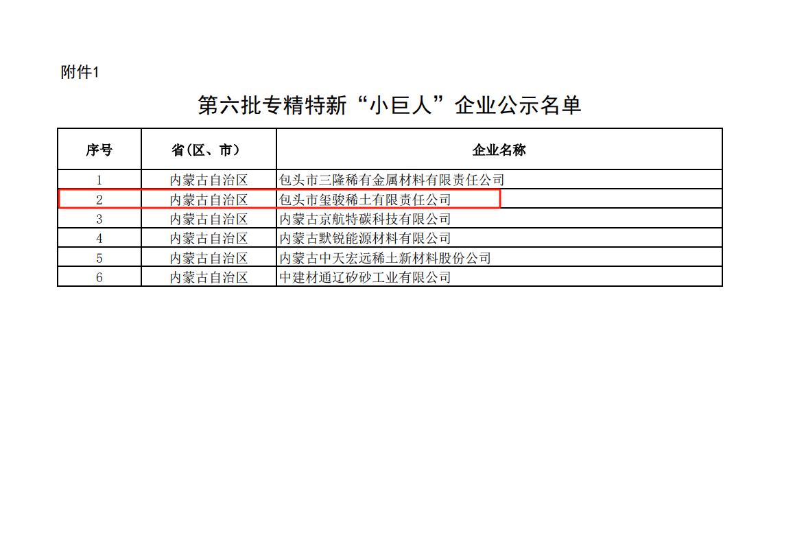 包頭市璽駿稀土有限責(zé)任公司 成功入選國(guó)家第六批專精特新“小巨人”企業(yè)